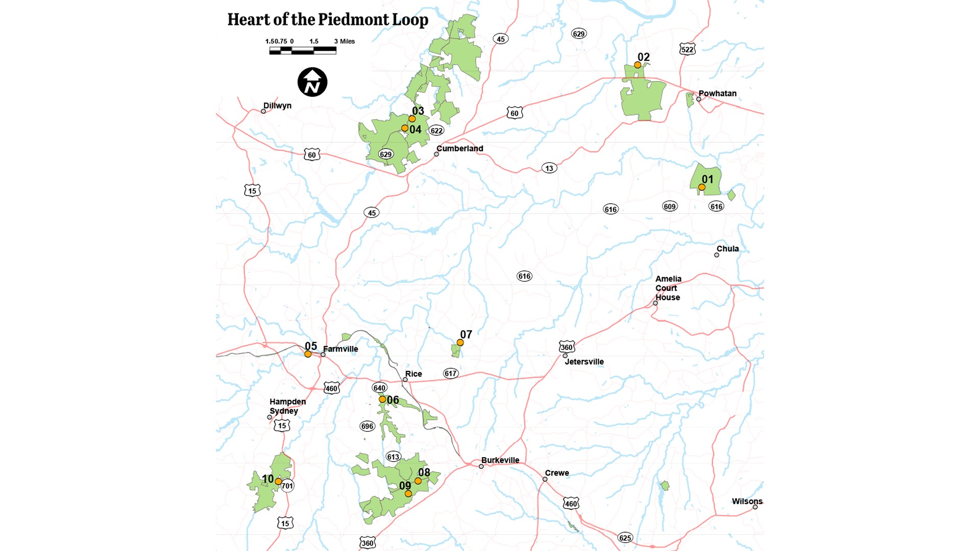 The Heart of the Piedmont Loop takes visitors into a series of state forests, state parks, and wildlife management areas with large tracts of deciduous and coniferous forest to explore. It also takes you through the area of the last major Civil War battle in Virginia at Sailor’s Creek. After losing 7,700 men and 8 generals, Robert E. Lee made his way to Appomattox where he surrendered to Ulysses S. Grant and reunited the nation.